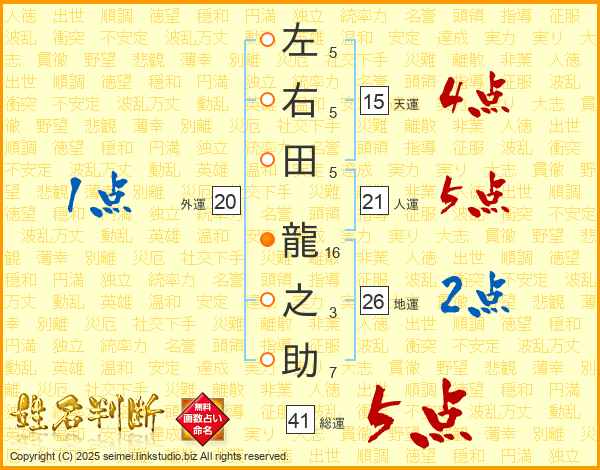 左(5画)右(5画)田(5画) 龍(16画)之(3画)助(7画)