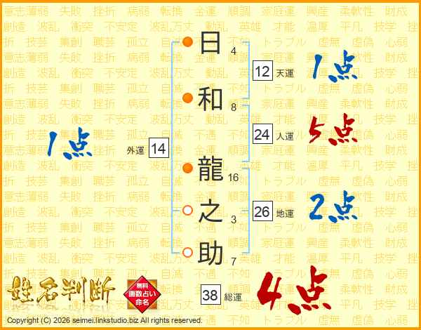 日(4画)和(8画) 龍(16画)之(3画)助(7画)