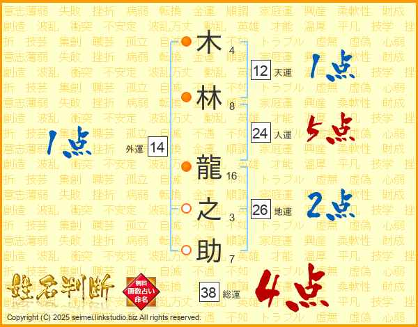 木(4画)林(8画) 龍(16画)之(3画)助(7画)