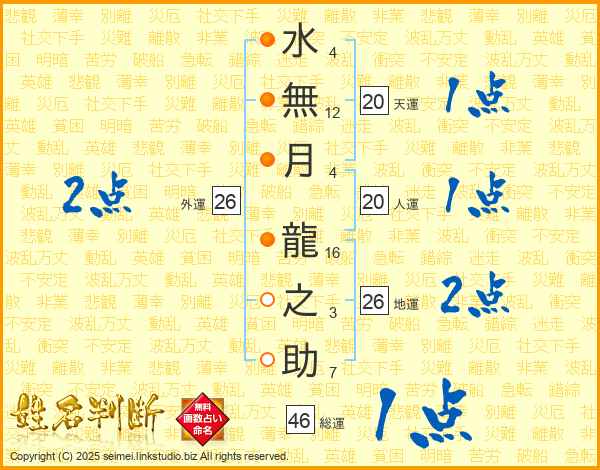 水(4画)無(12画)月(4画) 龍(16画)之(3画)助(7画)