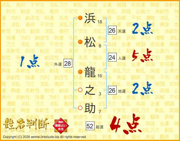 浜松龍之助さんの総運は52画の4点!