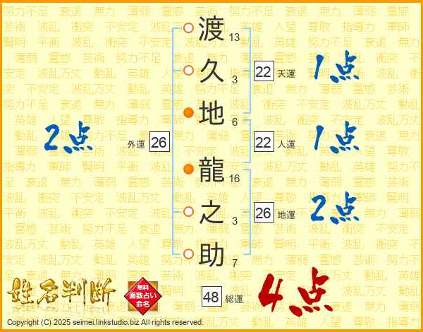渡(13画)久(3画)地(6画) 龍(16画)之(3画)助(7画)