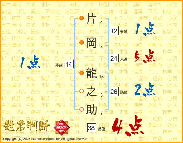 片(4画)岡(8画) 龍(16画)之(3画)助(7画)