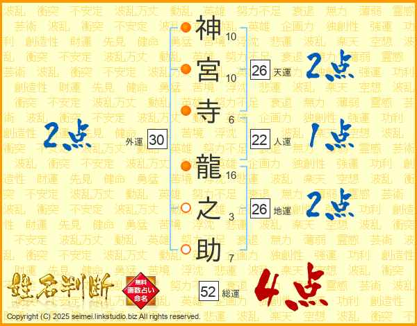 神(10画)宮(10画)寺(6画) 龍(16画)之(3画)助(7画)