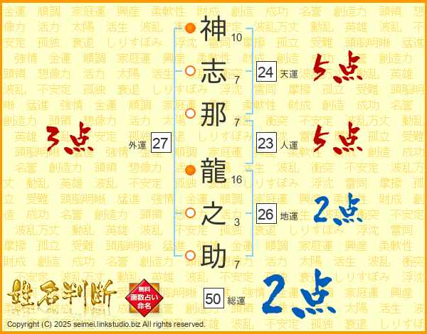 神(10画)志(7画)那(7画) 龍(16画)之(3画)助(7画)