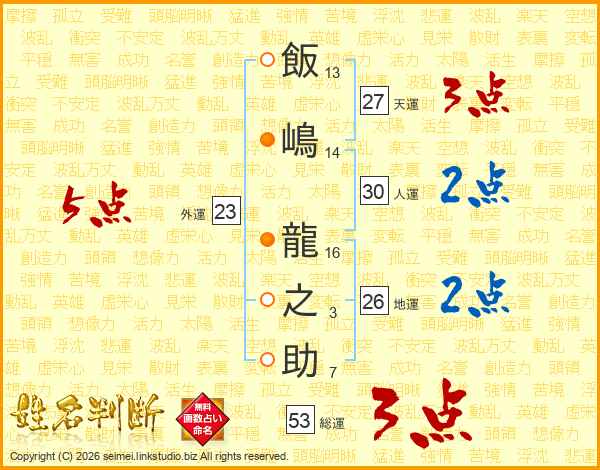 飯(13画)嶋(14画) 龍(16画)之(3画)助(7画)