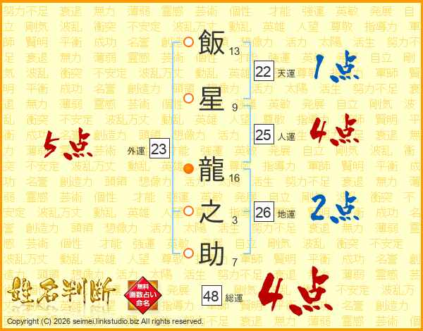 飯(13画)星(9画) 龍(16画)之(3画)助(7画)