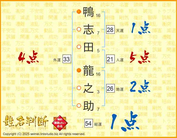 鴨(16画)志(7画)田(5画) 龍(16画)之(3画)助(7画)