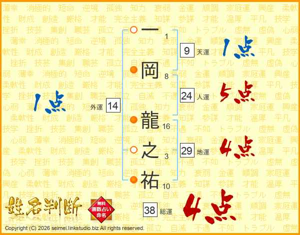 一(1画)岡(8画) 龍(16画)之(3画)祐(10画)