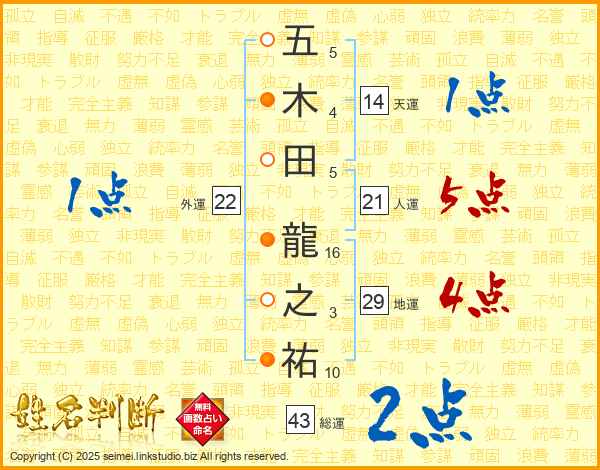 五木田龍之祐さんの総運は43画の2点!