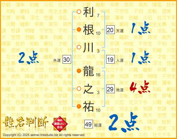 利(7画)根(10画)川(3画) 龍(16画)之(3画)祐(10画)