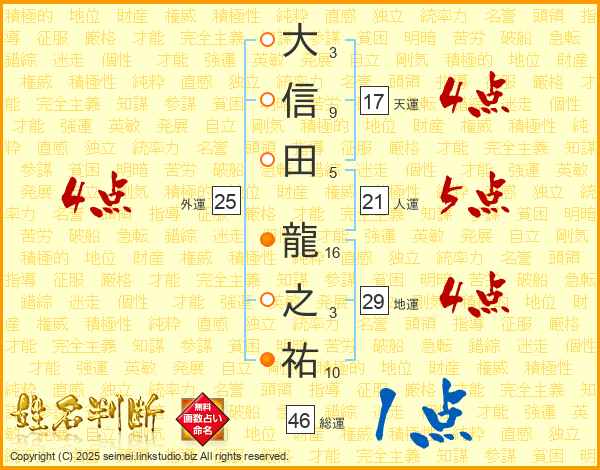 大(3画)信(9画)田(5画) 龍(16画)之(3画)祐(10画)