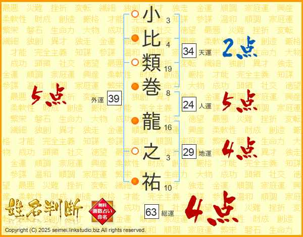 小(3画)比(4画)類(19画)巻(8画) 龍(16画)之(3画)祐(10画)