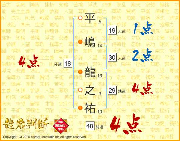 平(5画)嶋(14画) 龍(16画)之(3画)祐(10画)