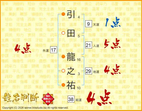 引(4画)田(5画) 龍(16画)之(3画)祐(10画)