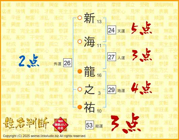 新(13画)海(11画) 龍(16画)之(3画)祐(10画)