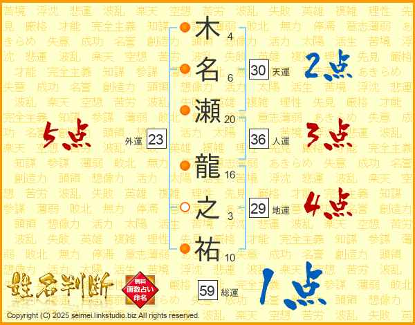 木(4画)名(6画)瀬(20画) 龍(16画)之(3画)祐(10画)