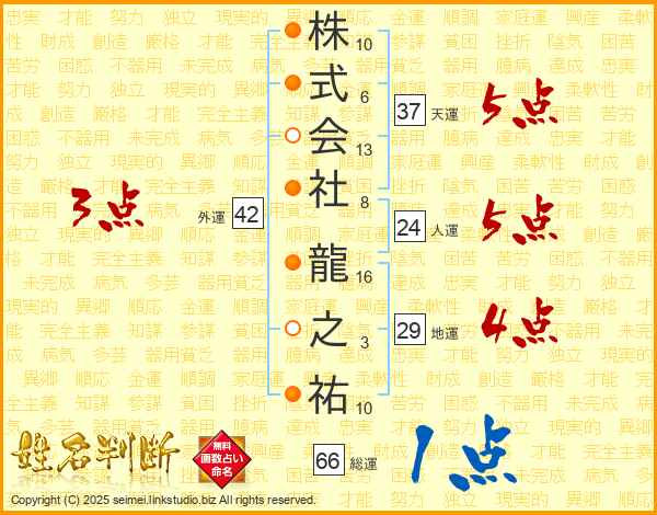 株(10画)式(6画)会(13画)社(8画) 龍(16画)之(3画)祐(10画)