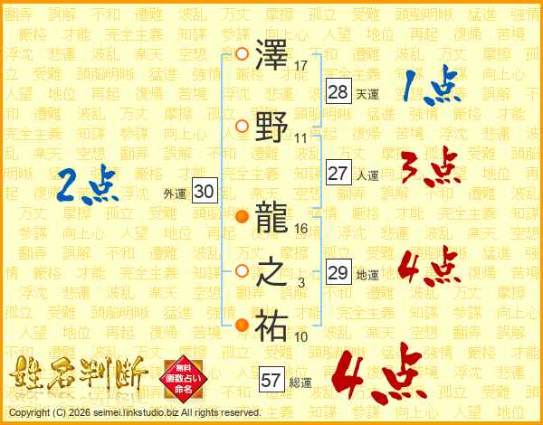 澤(17画)野(11画) 龍(16画)之(3画)祐(10画)