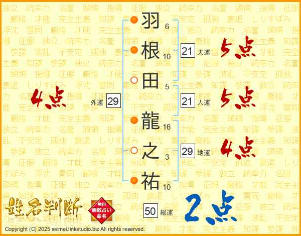 羽(6画)根(10画)田(5画) 龍(16画)之(3画)祐(10画)