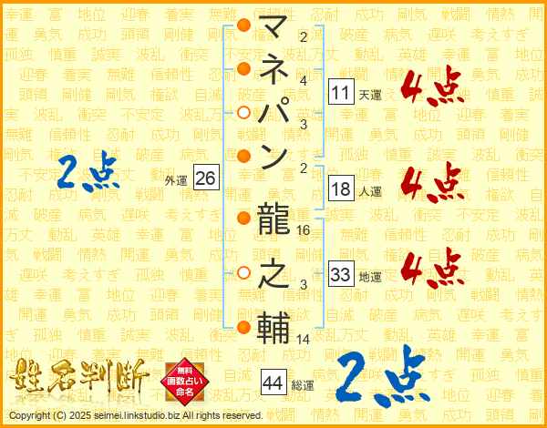 マ(2画)ネ(4画)パ(3画)ン(2画) 龍(16画)之(3画)輔(14画)