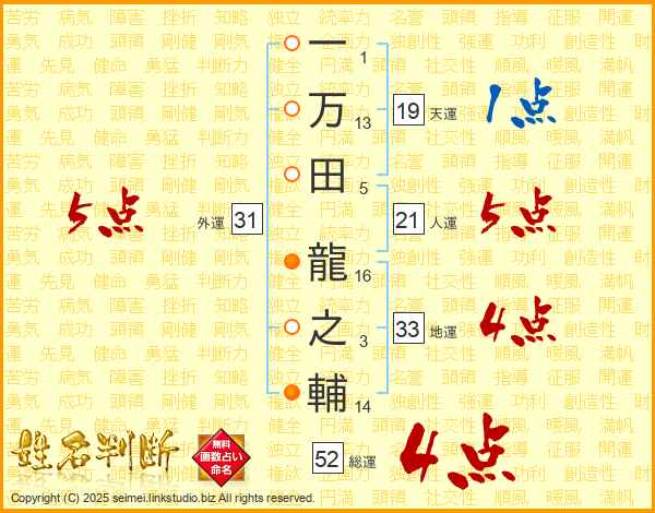 一(1画)万(13画)田(5画) 龍(16画)之(3画)輔(14画)