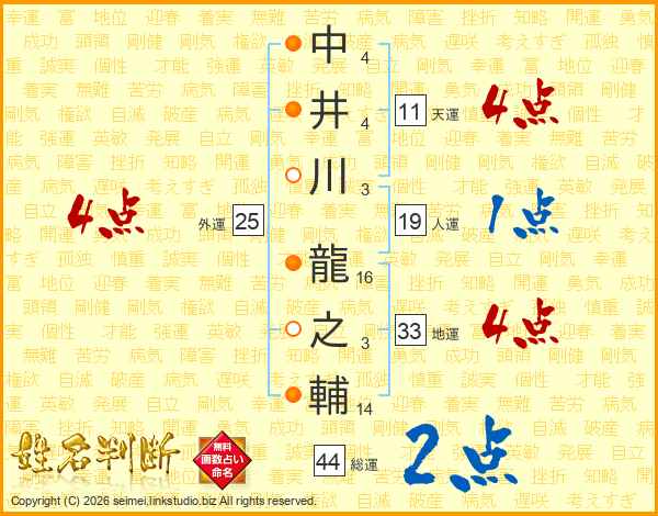 中(4画)井(4画)川(3画) 龍(16画)之(3画)輔(14画)