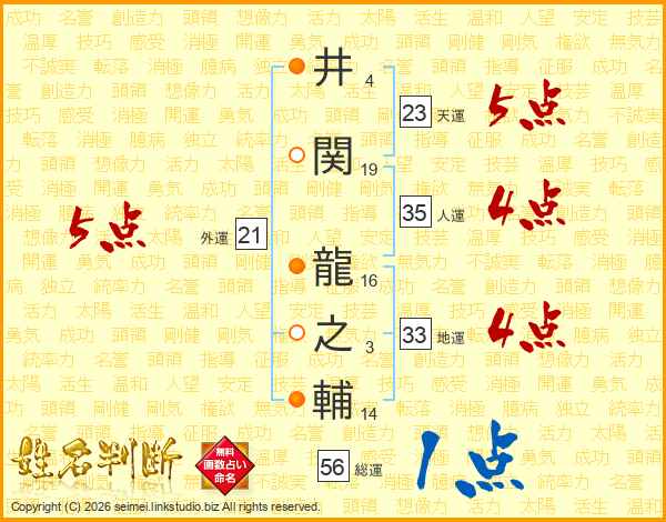 井(4画)関(19画) 龍(16画)之(3画)輔(14画)