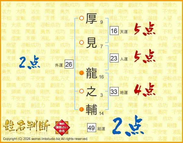 厚(9画)見(7画) 龍(16画)之(3画)輔(14画)