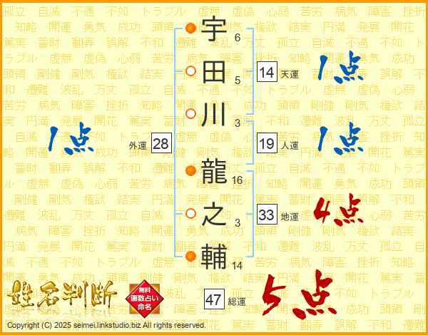 宇(6画)田(5画)川(3画) 龍(16画)之(3画)輔(14画)