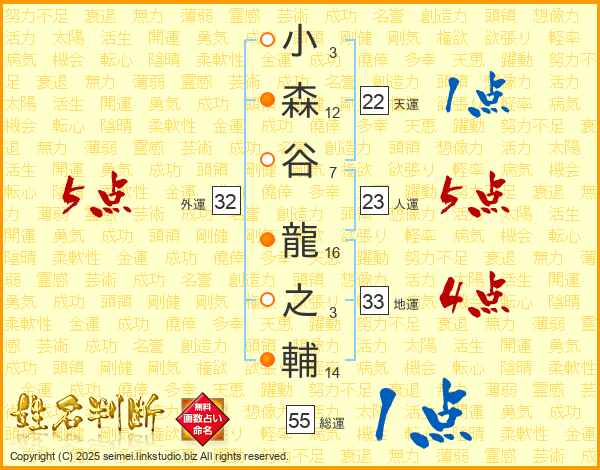 小(3画)森(12画)谷(7画) 龍(16画)之(3画)輔(14画)