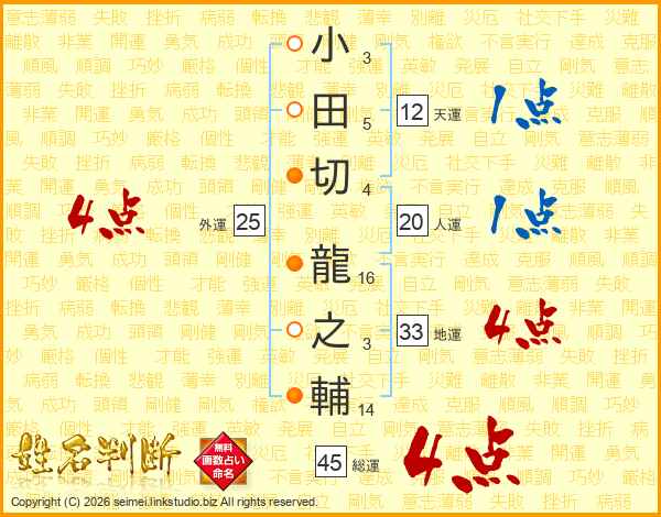 小(3画)田(5画)切(4画) 龍(16画)之(3画)輔(14画)