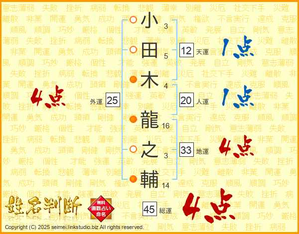 小(3画)田(5画)木(4画) 龍(16画)之(3画)輔(14画)