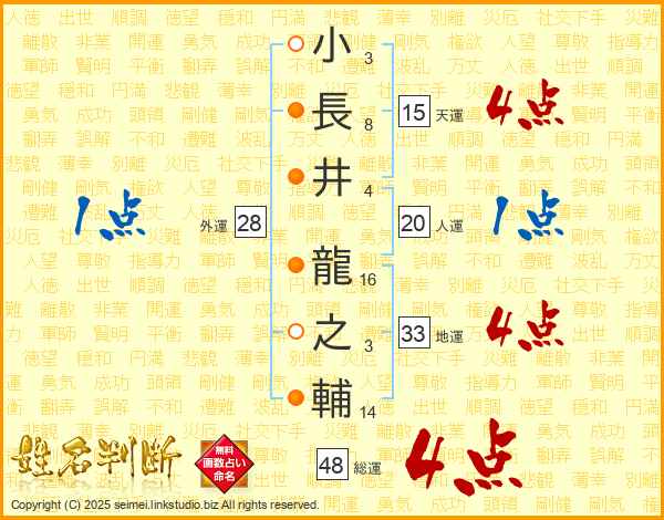 小(3画)長(8画)井(4画) 龍(16画)之(3画)輔(14画)