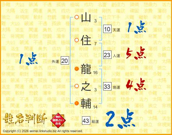 山(3画)住(7画) 龍(16画)之(3画)輔(14画)