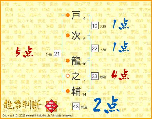 戸(4画)次(6画) 龍(16画)之(3画)輔(14画)