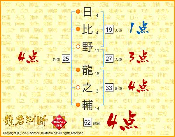 日(4画)比(4画)野(11画) 龍(16画)之(3画)輔(14画)