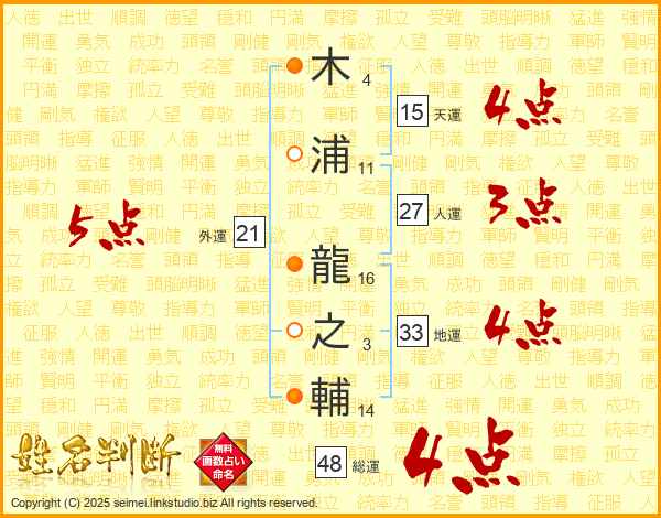 木(4画)浦(11画) 龍(16画)之(3画)輔(14画)