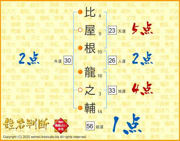 比(4画)屋(9画)根(10画) 龍(16画)之(3画)輔(14画)