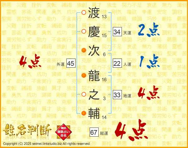 渡(13画)慶(15画)次(6画) 龍(16画)之(3画)輔(14画)
