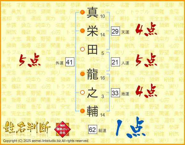 真(10画)栄(14画)田(5画) 龍(16画)之(3画)輔(14画)