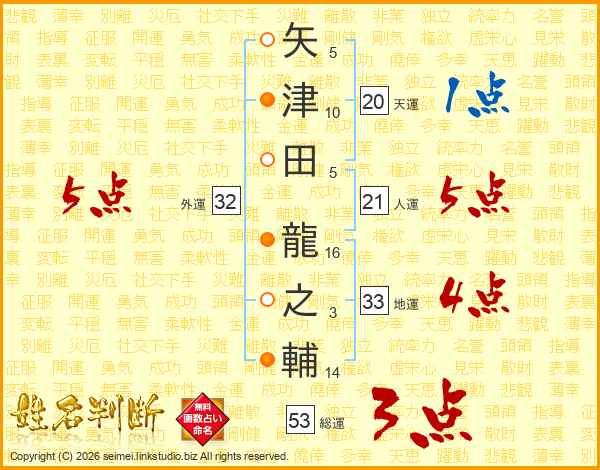 矢(5画)津(10画)田(5画) 龍(16画)之(3画)輔(14画)
