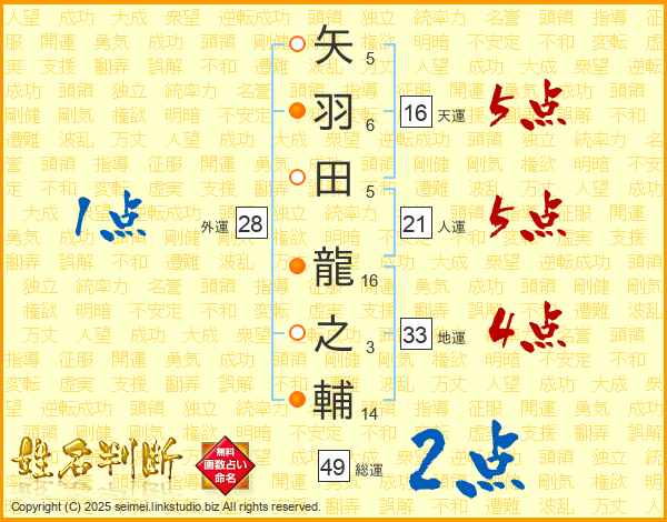 矢(5画)羽(6画)田(5画) 龍(16画)之(3画)輔(14画)