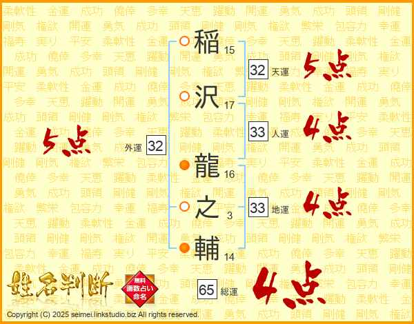 稲沢龍之輔さんの総運は65画の4点!