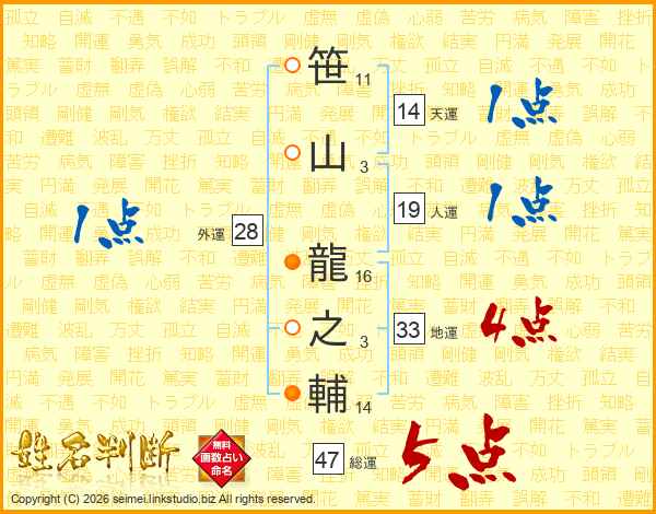 笹山龍之輔さんの総運は47画の5点!