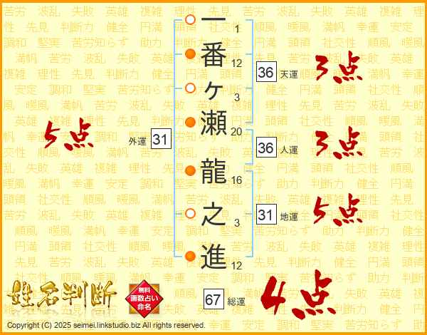 一番ヶ瀬龍之進さんの総運は67画の4点!