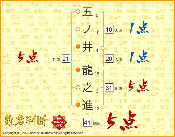 五ノ井龍之進さんの外運は21画の5点!