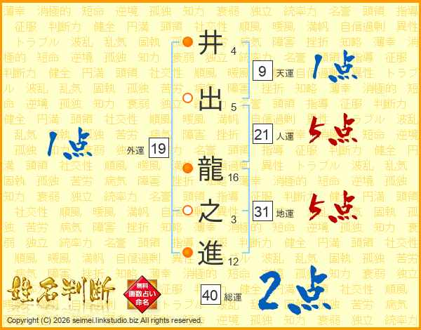 井(4画)出(5画) 龍(16画)之(3画)進(12画)