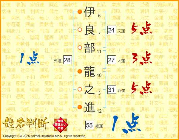 伊(6画)良(7画)部(11画) 龍(16画)之(3画)進(12画)