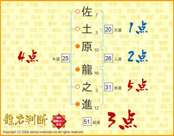 佐(7画)土(3画)原(10画) 龍(16画)之(3画)進(12画)